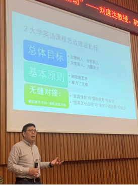 此次教师发展论坛主要由两场学术讲座构成,分别为刘建达教授所作的题为“大学英语教学指南背景下的大学英语评价与测试”的讲座,以及韩金龙教授的“一流课程建设视域下大学英语课程思政的实施路径探索”的学术分享会。
