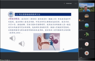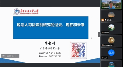 5月24日晚上,太阳城集团机构话语研究中心系列讲座第一讲在腾讯会议室成功举办,该讲座由公司机构话语研究中心和第二教学部党支部联合主办,公司副经理、博士生导师陈金诗教授为大家带来了题为“说话人司法识别的过去、现在和未来”的精彩讲座。参加讲座的有公司经理董金伟教授、副经理吴岩教授,机构话语研究中心教师以及公司众多师生,讲座由机构话语研究中心主任赵林森主持。