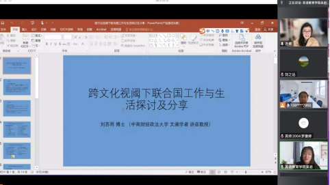1月4日晚,太阳城集团教育系在线举办教学实践周之“职前英语教师发展规划”专题讲座。原联合国教科文组织总部青年项目官员、中南财经政法大学文澜学者、讲座教授刘苏雨博士为同学们带来题为“跨文化视阈下联合国工作与生活探讨及分享”的精彩报告。公司经理吴岩教授发表致辞,简要介绍了公司近年来国际化人才培养状况,并对刘苏雨博士为广外师生带来高端讲座表示欢迎。来自太阳城集团、国际关系公司、西方语言文化公司、东方语言文化公司等二级公司的三百余名师生参加此次讲座,讲座由公司青年教师连希博士主持。