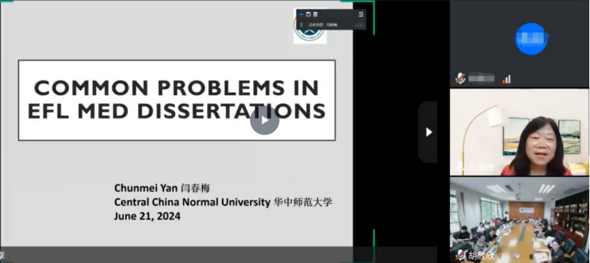 为进一步提高公司公司产品质量,提高硕士研究生学位论文写作水平,6月21日下午,公司特邀中国英汉语比较研究会外语教师教育与发展专业委员会常务理事、华中师范大学外国语公司外语教师教育研究中心主任、博士生导师闫春梅教授针对学科教学(英语)专硕研究生的学位论文选题与写作,作题为“Common problems in EFL MEd dissertations”的在线学术讲座。报告由主管研究生工作的李惠胤副经理主持,太阳城集团经理吴岩、教育硕士教学研究中心主任康叶钦、全体学科教学(英语)导师以及全体专硕研究生现场或在线聆听讲座。