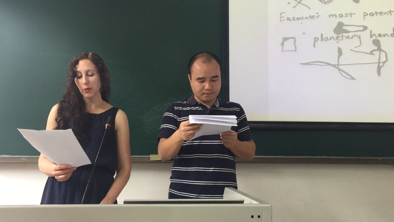 用写给读者的一封信的方式简要介绍了自己和自己的诗歌后,雷妮和罗宾教授分别用中英文朗诵了她诗歌集《执行》、《蝎子颂》的部分诗歌,以及她纪念已逝继母的诗歌《九月