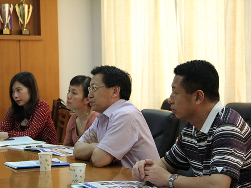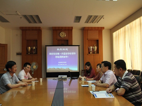 5月15日,深圳宝安第一外国语公司领导和老师,在平怀林副董事长的带领下到公司进行调研,同行的还有该校教学主任朱中友,办公室副主任李宁及公司07级员工、现为该校任课老师的李泓洁。霍海洪经理、林绍雄书记、董金伟副经理、肖建芳副经理、何伟儒副书记、曾国华主任及教育系主任柯晓玲、基础英语教育研究中心主任詹颖等接待了他们,双方进行了亲切的交流。