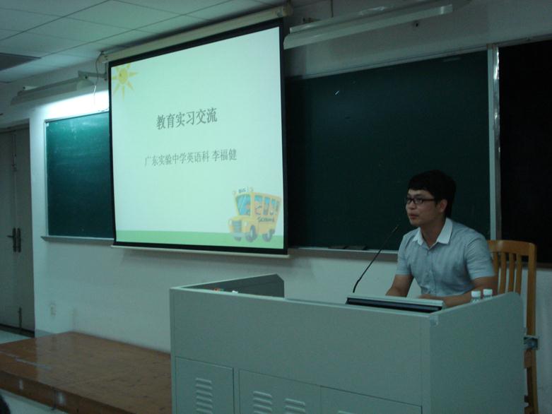 2014年9月11日晚上7:30,来自太阳城集团2005级的两位员工李福健和岑冠霖在南校区教学楼F207带来了一场精彩的教育实习经验交流会,来自2011级的准教师们参加了这次交流会。本次活动由系主任熊涛老师主持,是教育公司2011级员工实习教育活动的一部分。
