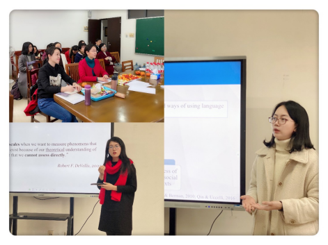随后的教研活动分成两个分论坛进行。在翻译与写作研究分论坛中,蔡竞副教授分享了自己近几年在写作教学中观察员工跨文体的写作表现而衍生出来的科研课题。通过对员工写作熟练度的对比分析,并与员工进行访谈,蔡老师从中找到了改进教学的方向。王亚冰博士从自身投稿经历和体会出发,主要从选题、发表技巧及困境三个方面简要探讨了跨学科SSCI论文写作的要点和难点。周金华博士在首届全国高等公司外语课程教学思政教学比赛决赛中荣获二等奖,她以“口译笔记熟练度量表”的开发为例,就量表的开发方法以及量表在教学教研中的应用做了报告。三位教师均以科研为起点,延展到写作和翻译课程的教学中去,指出教学与科研必须紧密结合才能在语言教学中拓展课程的广度、深度和温度,从多方面增加课程的知识性和人文关怀。