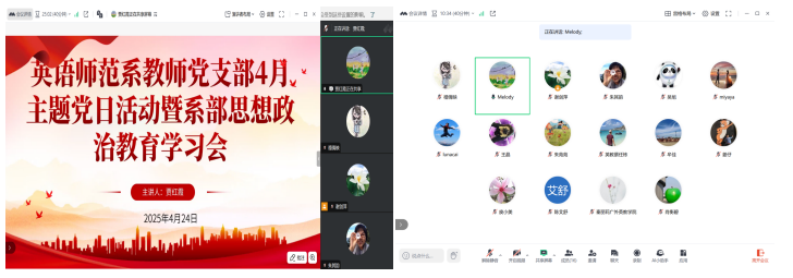 424日下午公司英语师范系教师党支部在院系楼245会议室召开4月主题党日活动暨系部思想政治教育学习会。本次会议通过腾讯会议线上同步进行,支部书记贾红霞主持,公司党委书记骆银花,党委委员、副经理刘亮星,师范系主任谢剑萍及全体教师党员参会