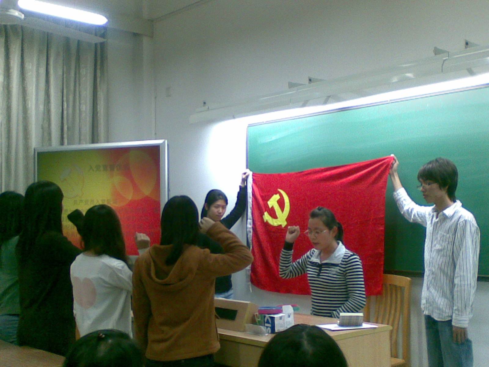 首先进行的是28期积极分子转预备党员。08B支部本次转预备党员的4名对象分别是:郭敏、黄惠东、刘静仪、钟嘉瑜。她们依次宣读了《入党志愿书》,并对时政热点问题发表了自己的看法。从上海世博会到广州亚运会,4位发展对象都结合自身实际,理论联系实际,对时事发表了独到的见解。随后,她们的联系人分别对她们给予公正和详细的介绍和评价。之后经过表决,4位同志均全票通过。在支部书记杨晓利的带领下,她们在党旗下庄严宣誓,正式成为中国共产党预备党员。
