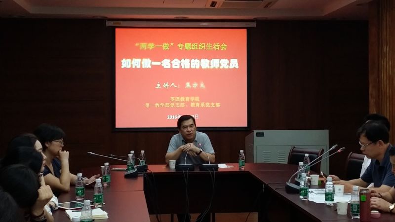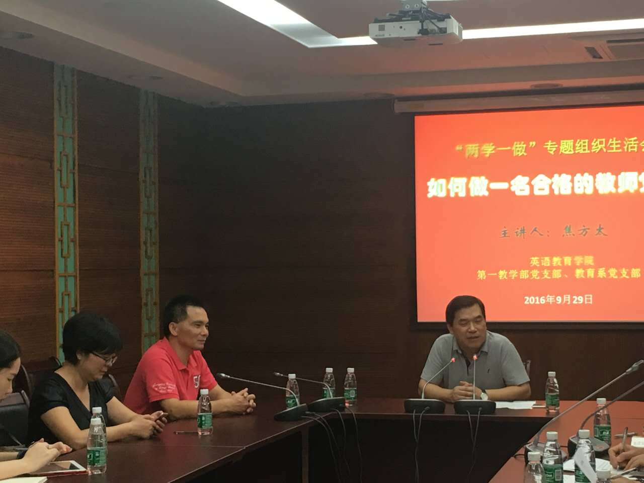 焦方太言简意赅地阐释了“两学一做”的内涵,解读了“合格的教师党员”标准。他强调:“两学一做”,基础在学,关键在做。“两学”,不仅要学习党章及其有关理论,还要读马恩经典,精泛结合。只有深厚的历史感,才会有深刻的现实感。做“合格的教师党员”不仅要政治觉悟高,而且要业务素质强。广外要建设成为国际化特色鲜明的高水平大学,广外人才培养要求教师出类拔萃。因此教师党员不仅要结合个人本职工作,教书育人,爱岗敬业,深入浅出,提纲挈领,一切为了员工,为了员工的一切,而且要规划在职进修,与时俱进,终身学习,不断充实自我,提升自己的国际化水平;严谨学风,通过人格魅力正面影响员工。接着,焦副董事长阐明了广外的历史发展决定了其国际化特色,并结合教育学专业如何借鉴澳洲UQ的国际化经验,精准指导如何在“in, to, on the fieldof study”做好文章,建设好教育学的核心课程,相关课程和国际视野的课程,培养国际化通用型人才。同时,他就如何国际化作了进一步的阐述,“请进来,走出去”,通过交流项目、英姿计划等活动、请进外教等环境建设,实现教师、教学、科研、管理等方面的国际化。