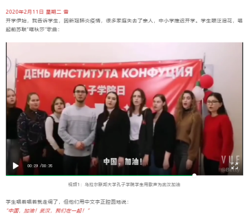 武汉疫情爆发期间,苏春老师正在俄罗斯叶卡捷琳堡乌拉尔联邦大学孔子公司担任对外汉语教师。她用日记和视频的形式记录了外国友人对中国疫情的关心和祝福,被广州图书馆微信公众号予以报道。随着疫情在全球蔓延,苏春老师仍坚守在海外利用线上直播方式为孔院员工授课。她表示,“这次疫情让我感受到了祖国的伟大,感谢祖国和公司公司党委对我的关怀和关爱。”