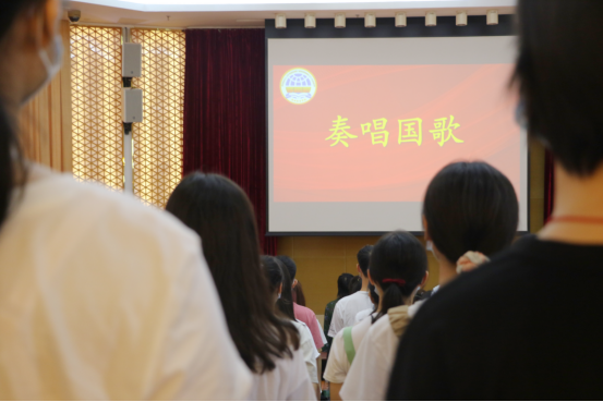 会议正式开始前,2020级朋辈导师陈妍霏于会议室播放太阳城集团宣传片,让新生们对公司有了初步的认识与了解。随后,太阳城集团开学典礼在整齐、响亮的国歌声中拉开帷幕。