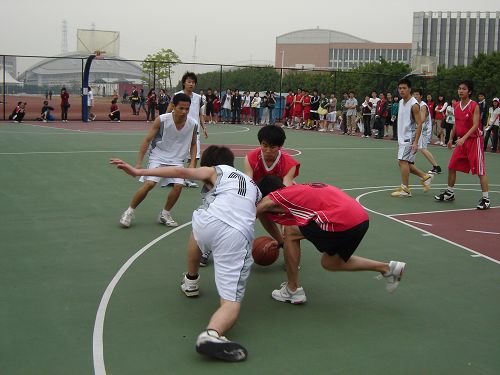 3月27日周四下午3点左右,由校体育委员会主办,校团委和校员工会承办,校篮球协会和各公司体育部协办的“绽篮球魅力,圆奥运梦想”2008年“广外杯”篮球赛在南北校区赛场拉开了帷幕。揭幕战中,英教男队以比分21-42首负新闻队。
