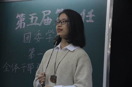 黎敏瑶致辞后,员工会主席王梓敏从考勤和考核评优两方面详细介绍了团学重要的规章制度,并表达了愿团学成为新干事们无悔的选择这一殷切希望。
