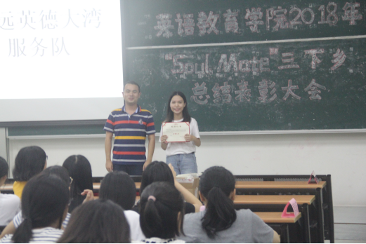在接下来的表彰环节中,获得院级优秀队伍称号的是清远英德大湾服务队。获得院级优秀个人奖的则是清远英德大湾服务队的冯春霈、林煌博、莫舒华以及Moonlight三下乡服务队的阙晓琳、牛勇翔、黄光耀。