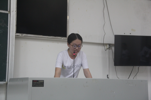 Moonlight服务队队长邱思琪则向我们的介绍了Mooonlight三下乡服务基地以及队伍建设的具体情况,向在场的同学展示了moonlight队伍丰富的课程设置以及精彩的调研、文娱、团建活动。她指出,三下乡是一个很好的机会,能让我们在组织策划、应急事件处理等各方面的能力得到锻炼和提升。