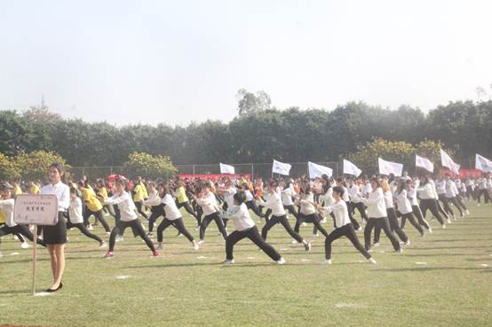 紧接着,艺术体操队与啦啦队为在场师生献上一段动感十足、柔美婀娜的舞蹈。而在此之后,近900名师生则共同表演了“蔡李佛拳”。他们的身姿灵活矫健,气势雄浑壮阔,赢得现场观众的阵阵掌声。