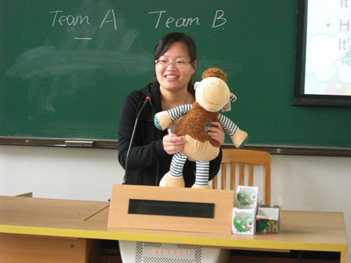 “Teaching for a life”,为了演绎这一理念,参赛选手们各出奇招。胡伟娜同学带来了一堂关于天气变化的课,可爱的毛公仔Ben作为课堂用具吸引了员工的目光,欢快的歌声寓乐于学习中,活泼的肢体动作加深了员工的记忆。这边的课堂还没下课,那边的高小燕小老师就开始上起充满温情的感恩课了。在贴好精心准备的图画卡纸后,充满激情的她问道:“Do you remember your birthday? And do you remember your mother’s birthday?”她用生动的图画展示了一位母亲的生命历程,将知识与亲情相结合,不仅让员工掌握了现在完成时的语法,也教会了他们学会感恩。王佳同学用心构建起自己的微笑课堂——“some expression about smile”,真诚的笑容打动了评委,与员工积极互动的游戏也获得了好评。“Teaching for a life”不仅指在教学中展现生活,感受生活,还寓意在教学中提升生活。周炫同学用一口流利的英语讲解怎样包饺子,以英语为载体传递了我国的传统文化;陈静仪同学则选题“The art of speaking”,介绍礼貌的说话用语与方式,突出要兼具说话礼仪与宽容心态的主题。