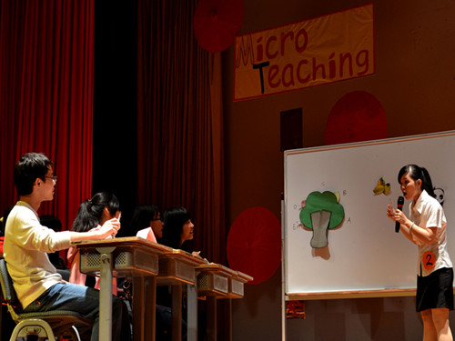 当然,提起MT,自然少不了模拟员工的参与。熟知MT比赛的人都知道,模拟员工不但在比赛中扮演着配合选手课堂进程的角色,有时也要成为“trouble student”来考验小老师们的临场反应能力。但是这怎么难得了我们机智的选手,正所谓:兵来将挡,水来土掩。黎日娥巧用手机铃声化解了难题;陈文亮的一句“I bet you will be the winner”使之成功过关;王佳让员工自己拾起梳子的处理方法更是得到了评委老师的认可;更令观众佩服的是董沛文用一句韩文简简单单地“收服”了因为前一天夜里看韩剧而上课打瞌睡的trouble student,再次引发现场观众的笑声和掌声。