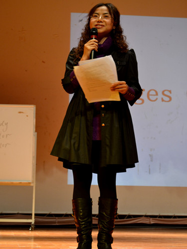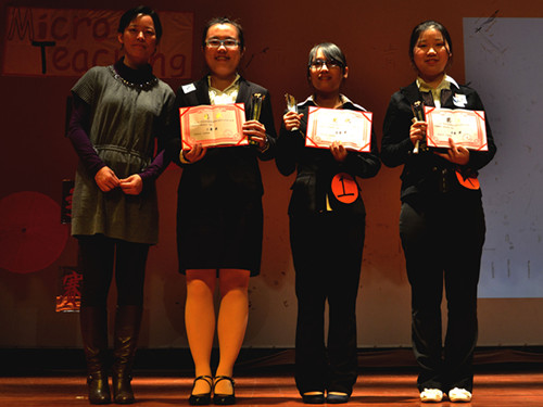 第一位上场的选手黎日娥以“About Chrismas”为主题,利用图片、游戏与员工进行互动,让员工在反复的操练中掌握新句型、新单词。身着短袖上装的二号选手潘英冰一登场,便以可爱的热身操引燃全场气氛。warm-up过后,她那制作精美、色彩丰富的水果教具牢牢抓紧了台上乃至台下的所有眼球。三号选手陈文亮来自政管公司,她善用自己的图片与员工拉近距离,并且巧妙地运用选举和讨论的形式阐述“A friendly person”,流利的口语、自信的台风,使她展现出丝毫不逊于英教学子的风采。四号选手王佳紧扣“smile”这一温暖的主题,借助可爱的图片和员工表演来描述smile,摆脱了传统死板的教学,让课堂变得趣味盎然。而五号选手董沛文走的则是活泼路线,她利用身边的实际事例与真正的初中课本,为在场的所有人员带来了一场别出生面的听力课,赢来观众阵阵掌声。最后登场的六号选手朱昱诚选择的则是高中二年级关于卓别林的阅读课文,他的成熟老练一扫平时阅读课的枯燥与乏味,开场的两个著名谐星的视频——赵本山和小沈阳的春晚小品《不差钱》以及卓别林的《摩登时代》逗趣片段在极短的时间内调动起员工的浓浓兴趣。