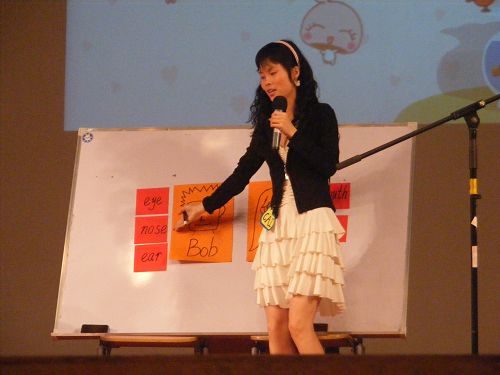 首先出场的是CAI组合。他们利用“Word Matching”,“Acting Time”等游戏调动员工的兴趣。不仅模拟员工,现场观众也被她们的教学技巧深深吸引。