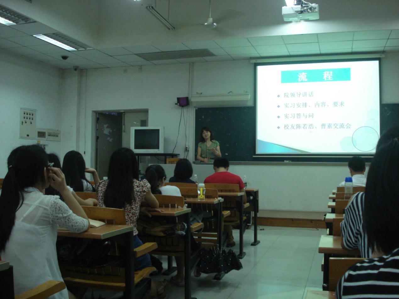 大会开始,谢剑萍老师简单介绍了本次动员大会的具体流程:院领导讲话;实习安排、内容和要求;实习问与答;以及员工陈若浩、曹素交流会。