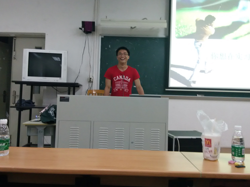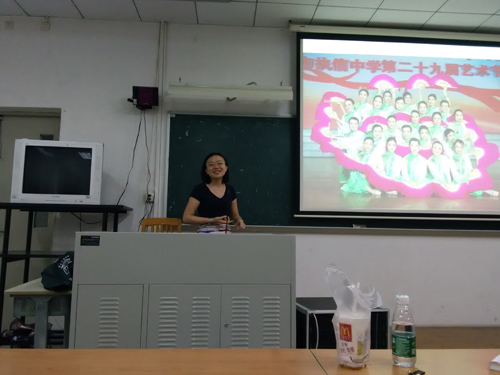 最后,动员大会迎来了最后一个环节“员工陈若浩、曹素交流会”。陈若浩师兄与曹素师姐两人都是2010年毕业于英教的员工,同时,他们二人现在也都在广州执信中学任教。陈师兄以一则“柚子”笑话开场,现场气氛一下子活跃了起来。陈师兄与我们分享他个人的大学实习以及就业经历,他很用心地将自己的简历搬上PPT,与师弟师妹交流实习就业心得体会并且分享他为人师的经验感悟。例如:jump out of book、reflection、尽量做到student-centered等等。他希望师弟师妹能做一个有自己独特优势且有担当的人,并祝愿师弟师妹能顺利完成实习工作。随后,曹素师姐也上台与我们共同分享了她忙并快乐着的教书日子。她认为“老师是获得幸福感最快最直接的一种职业”,希望师弟师妹能够在实习中享受当教师的快乐并为以后正式走上职业道路积累经验。同时,她也给予师弟师妹许多中肯的建议。