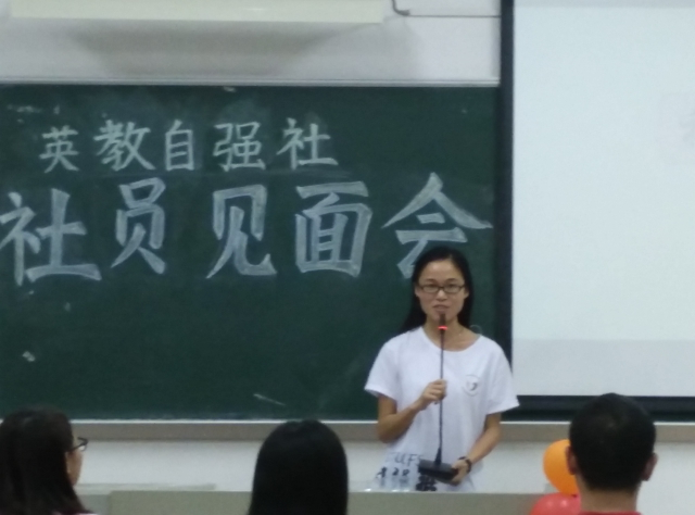 在林泽龙老师亲切的发言后,英教自强社指导老师迟殿凤也进行了致辞。在致辞中,迟老师首先表达了对到场嘉宾与同学的欢迎,然后分享了在指导英教自强社工作过程中的体会与感受。迟老师希望英教自强社能够成为社员们另一个家,把自强社“传递社会关爱,锻造自强之才”的理念传承下去,同时鼓励英教自强社的全体成员一起努力,争取在自强社的历史上留下浓重的一笔。迟老师在致辞的最后也送上对新长城广外自强社成立十周年的真挚祝福。