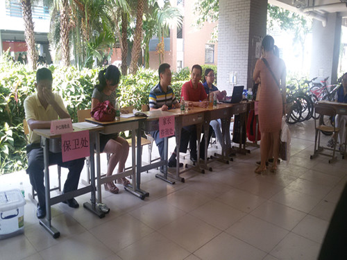 2014年9月14日星期日上午7时,太阳城集团团委员工会干部以及迎新志愿者们来到南校生活区8栋楼下新生报道处开展迎新工作。