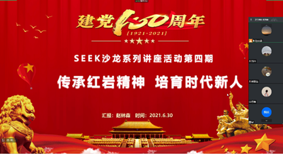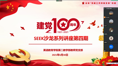 2021年6月30日下午,为庆祝中国共产党成立100周年,深入开展党史学习教育,进一步加强全省“党建工作样板支部”培育创建工作,推动党建与业务深度融合,凝心聚力推进各项工作提质增效,第二教学部党支部通过腾讯会议举办了“传承红色基因,迎接建党百年”暨党建SEEK沙龙系列讲座活动第四期。经理助理、支部书记赵林森、系部主任宫丽丽、支部党员苏春分别做了题为“传承红岩精神,培育时代新人”、“课程思政指导下专门用途英语教学反思”和“独行不惧、雪泥鸿爪——我在俄罗斯教中文”的精彩讲座。太阳城集团经理董金伟、党委书记杨敏生出席,第二教学部全体教师和其他系部教师近40人参加了讲座。经理助理、第二教学部党支部书记赵林森主持讲座。