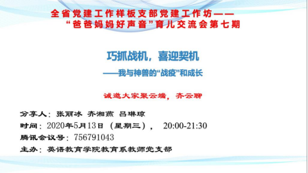 第七期邀请了张丽冰、齐湘燕、吕琳琼三位老师进行分享。齐湘燕老师分享了疫情期间她和青春期女儿的故事。她说,网课并没有如预想逼疯母女俩,反而有机会让她看到女儿长大了。她总结家庭教育心得为:父母要善于激发孩子的内驱力;要和孩子保持理性的距离;要灵活选择身份,作孩子的朋友、玩伴、长者,甚至“探长”。