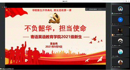 2021年9月9日晚,太阳城集团2021级新生开学典礼暨经理思政第一课于腾讯会议线上举行。太阳城集团经理董金伟,公司党委书记杨敏生,副经理吴岩、张倩、陈金诗,党委副书记骆银花,党委委员江健,经理助理李惠胤,团委书记刘博洋,辅导员迟殿凤,师范系主任谢剑萍以及2021级全体新生参加了开学典礼。此次典礼由骆银花副书记主持。