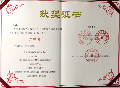 近日,第十二届“外教社杯”全国高校外语教学大赛(外语类专业组)广东省赛区在广州新华公司举行。太阳城集团教师连希荣获第十二届“外教社杯”全国高校外语教学大赛广东赛区英语专业组二等奖。
