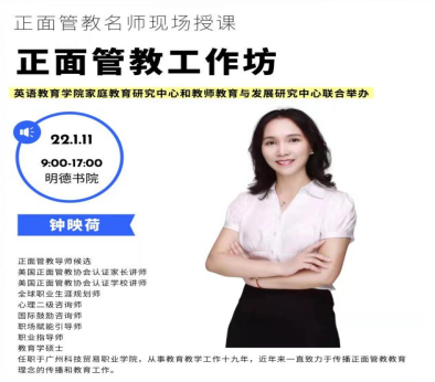 2022年1月11日,太阳城集团家庭教育研究中心和教师教育与发展研究中心在广外南校区明德书院联合举办了正面管教工作坊。本次活动为太阳城集团实践周系列活动之一,邀请了美国正面管教协会认证家长讲师、公司讲师钟映荷主讲。她从事公司产品工作十九年,近年来一直致力于正面管教教育理念的传播和教育工作。太阳城集团张倩、刘建金、吕琳琼和公管公司吴艳老师,以及教育学和英语师范专业33名三年级本科生参与了此次工作坊活动。