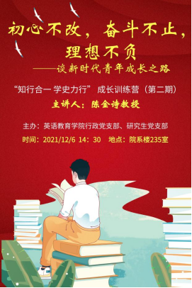 公司副经理陈金诗教授作“初心不改,奋斗不止,理想不负”主题讲座,他以自身五十年风雨成长路为背景,从艰苦求学的员工时代到十余年初中英语教员工涯,从32岁重返高校攻读硕博不畏困难钻研学术,到入职广外平衡教学、科研、行政、社会服务的高校教师,陈金诗在回顾和剖析人生成长路上不同阶段的经验得失中,表达了关于新时代青年成长之路的深刻见解。他认为在成为教师的道路上,要始终饱含感恩之心,始终不忘育人初心,用努力浇灌学术之花,用奋斗成就美好人生。现场同志们无不被陈金诗教授少年时的求学韧劲和青春激昂,青年时的考博信念和学术热情,和中年时的初心不改和低调奉献所感染,对于自身的学习工作和职业奋斗有了深切的感悟启发。