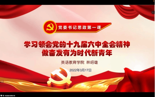 林绍雄最后强调指出,党的十九届六中全会在党的历史上具有极其重大的里程碑意义,学习贯彻全会精神是当前和今后一个时期的重大政治任务,同学们要进一步增强政治自觉、提高政治站位,牢牢把握会议的鲜明主题和战略考量,自觉把思想认识统一到全会精神上来,努力以全会精神指导自己的学习生活。他呼吁同学们做奋发有为的时代新青年,对同学们提出了三方面的要求:树立坚定的理想信念,深入学习践行习近平新时代中国特色社会主义思想,深刻领会“两个确立”的重大意义和实践要求;锤炼高尚的道德品质,根据新时代的新要求,加强道德修养,怀德自重;掌握过硬的知识本领,学会担当社会责任,让自己的聪明才智更好地为国家服务。他期望同学们在学完本次思政第一课之后有所启发,能够自觉肩负历史使命,立大志、明大徳、成大才,不负时代,不负韶华,成为实现中华民族伟大复兴中国梦的先锋力量,让青春在为祖国、为民族、为人民、为人类的不懈奋斗中绽放出绚丽的光彩。