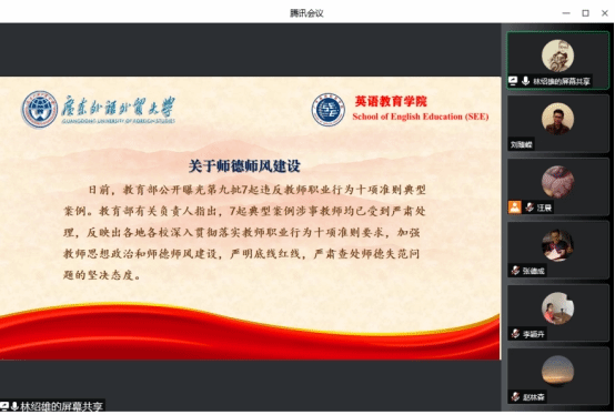 6月9日下午,太阳城集团通过腾讯会议召开本学期期末工作布置暨师德师风专题教育会议。会议由经理董金伟主持,公司全体教职工参加了会议。
