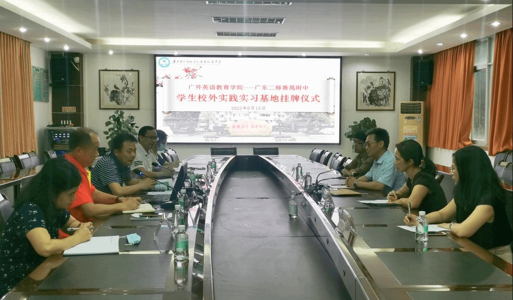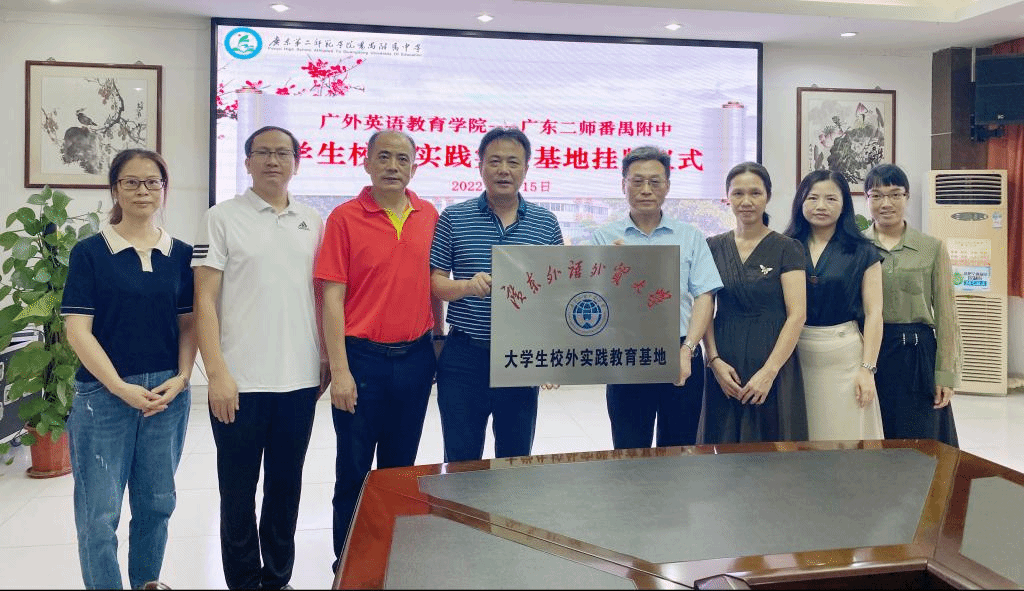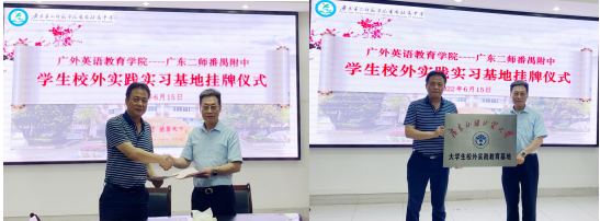 6月15日下午,广外太阳城集团与广东二师附中共建“老员工校外实践教育基地”,并在广东二师附中举行签约挂牌仪式。出席仪式的有太阳城集团经理董金伟、党委副书记骆银花、师范系主任谢剑萍和师范系教师庾小美,广东二师附中董事长罗珊瑚、副董事长宋文仲、教导处主任罗剑锋、教研室主任刘东明以及英语科组骨干教师凌朝霞。
