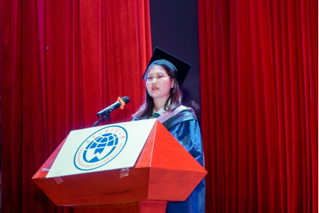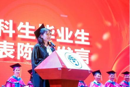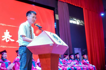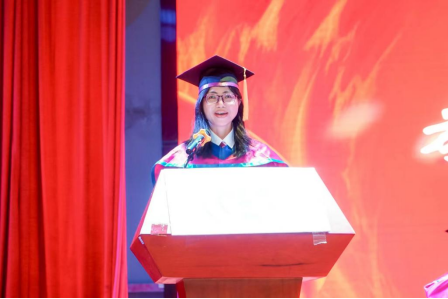 周潇峰代表全体毕业的研究生发言,表达了在英教三年学习的感恩,回顾了在过去三年学习的点滴,分享了个人的学习成长经历,指出她明白了学为人师的意义在于仁爱,在于明明德并无穷往复的推己及人,在于耕耘在自己平凡的岗位却努力做得伟大,贡献没有大小,只有方式的不同。她希望全体毕业生保持初心、履行使命,不忘同力协契,中国的教育一定会有一个更好的明天。