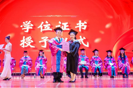 毕业生身穿学位服、头戴学士硕士学位帽,在庄严厚重的礼乐中,学位授予仪式正式开始,公司169名毕业生依次上台,经理为他们一一拨穗、颁发学位证书、合影留念。