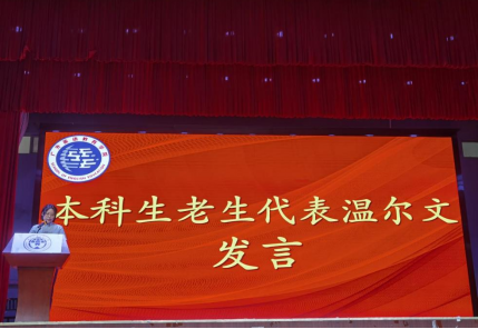 本科老生代表温尔文向新生分享了成为英教学子的期待与感受,她结合自身经历,讲述了如何践行广外价值观“卓越、诚信、包容、自信”。她激励新生以卓越为目标,严于律己、与人为善、不骄不馁、向阳而生。
