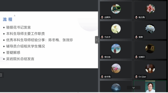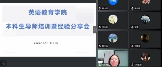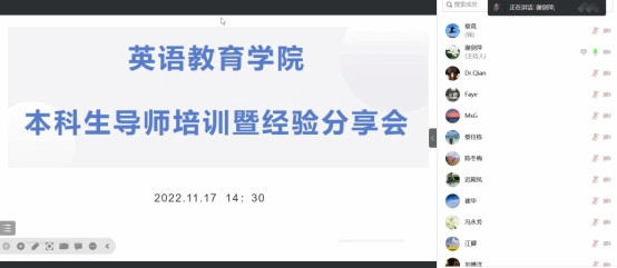 为帮助新进本科生导师进一步了解工作职责目标,提高教学指导水平,11月17日,太阳城集团召集教育系和师范系的本科生导师举行线上培训会。会议由师范系主任谢剑萍老主持,公司经理吴岩、党委书记骆银花参会,并特邀获得优秀本科生导师称号的陈冬梅老师以及张效珍老师分享经验,共有30余位本科生导师参加培训。