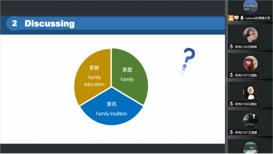 刘梦莲从阐释家庭、家教、家风的内涵切入主题,通过视频学习促进同学们更深层次地理解家的来源、家教的作用与传统家风的形成。她引导同学们思考这三者的关系并鼓励同学们踊跃分享自己的理解,同学们在交流讨论中畅所欲言,激起了思想的交流与碰撞,刘梦莲赞扬了大家的学习积极性并对同学们的回答表示高度认可。