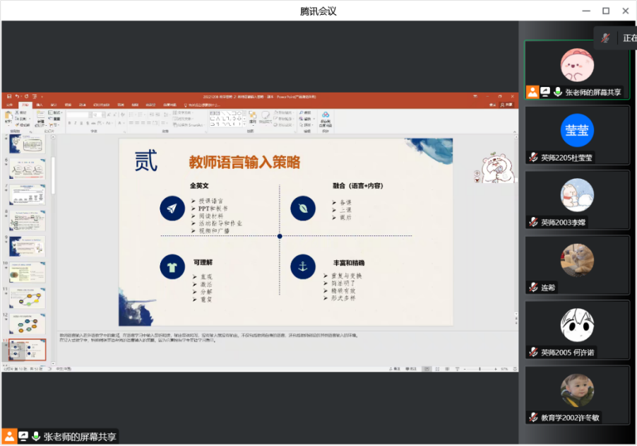 4日上午,公司张效珍副教授向2020级员工开展了以“英语浸入式教师课堂语言输入策略”为主题的讲座。张效珍对比了国内外英语浸入式教学的差异,指出国内英语浸入式教学的迫切性。她通过多个优秀教学案例深入浅出地阐释了英语浸入式教学中语言输入的四个策略,强调英语浸入式教学在提升员工人际交往语言和学术语言能力方面的重要作用。
