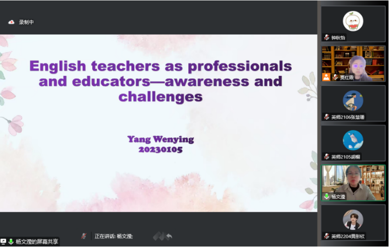 5日上午,广州大学外国语公司杨文滢教授为2021级员工作学术讲座:English Teachers as Professionals and Educators--Awareness and Challenges。杨文滢教授从profession和education的定义和内涵入手,讲解了教育的重要意义与英语学科公司产品的特殊性。她着重讲解英语师范生应确立的一些英语教育理念、目标与方法,强调了“学高为师,身正为范”的为师守则。杨文滢教授鼓励同学们努力学习专业知识,在未来成为一名优秀的人民教师,为祖国教育事业奉献力量。