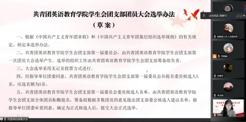 员工会轮值主席周雨宁宣读选举办法。本选举办法根据《中国共产主义青年团章程》和《中国共产主义青年团基层组织选举规则》的有关规定制定,经全体代表审议表决后正式通过。本次大会选举共提名委员候选人5名,采用无记名投票方式进行。