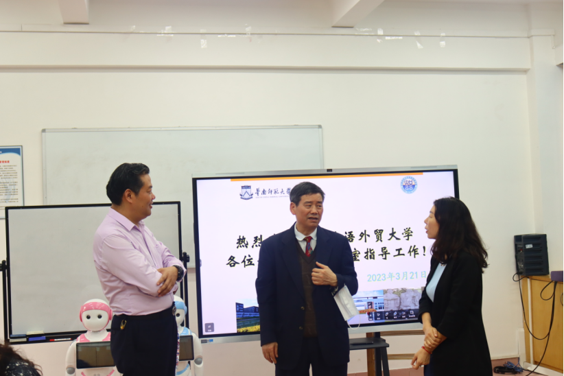 陈金诗部长、吴岩经理一行饶有兴致参观了华南师范大学德育神经科学与人工智能实验室,认真听取了黄甫全教授关于华师教育人工智能开发历程和研发成果的介绍,仔细观摩了AI教师与真人教师联合执教的微课视频,并就两校间合作共建华南师范大学德育神经科学与人工智能实验中心广外分中心进行了卓有成效的交流。