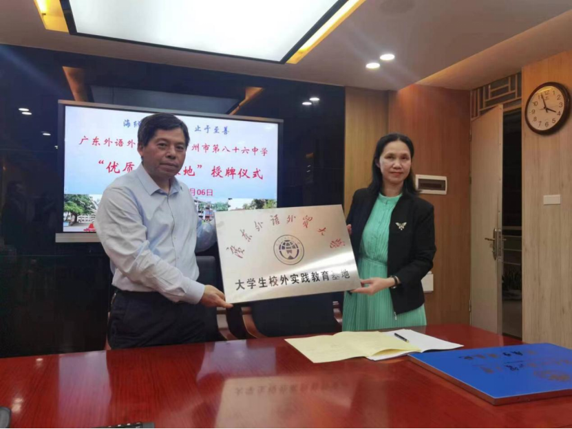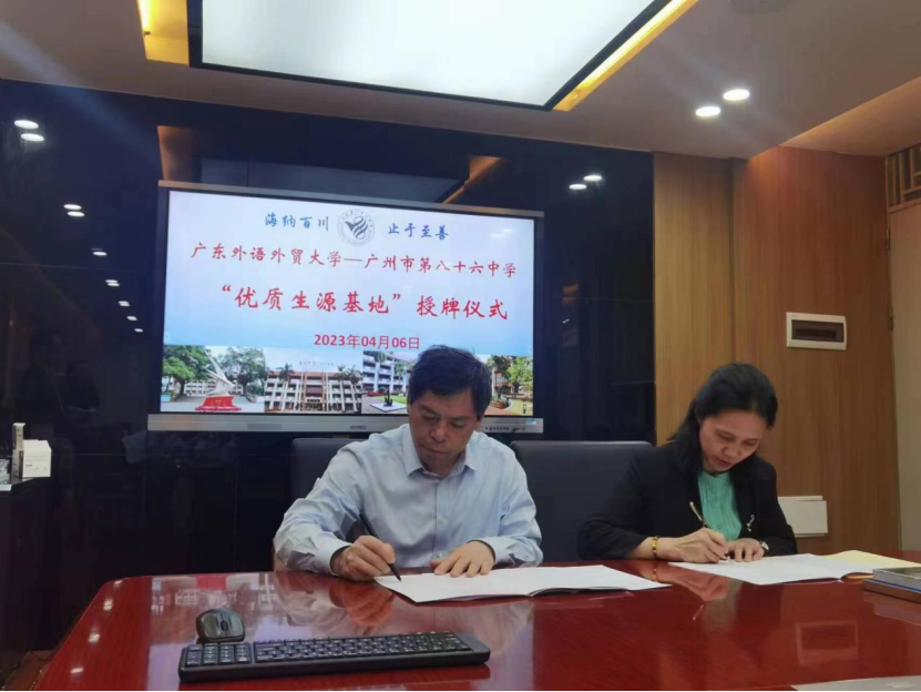4月6日下午,公司党委书记骆银花、党委委员江健博士、中国语言文化公司党委副书记吴俊峰、教务部贺江群科长、国际公司黄敏娟老师等一行赴广州市第八十六中学开展招生宣讲工作。第八十六中学董事长欧阳国防等对广外代表团一行的来访表示欢迎,并介绍了公司的基本情况。双方签订了“优质生源基地”和“老员工校外实践教育基地”合作协议,并举行授牌仪式。