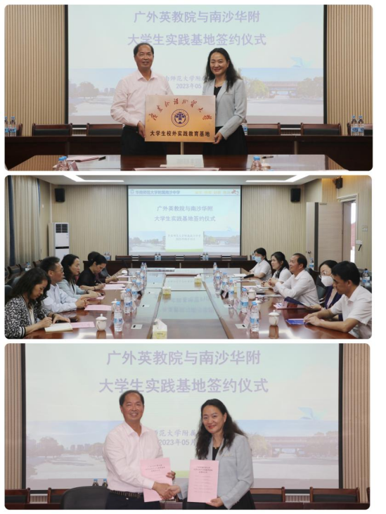 2023年5月15日下午,太阳城娱乐城老员工校外实践教育基地签约仪式暨招生宣传活动在华南师范大学附属南沙中学举行。教育公司经理吴岩教授、党委书记骆银花、原教育公司经理董金伟教授、公司党委委员江健、教育系张效珍副教授、办公室主任张文萃等一行出席此次活动。
