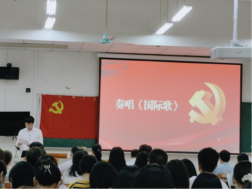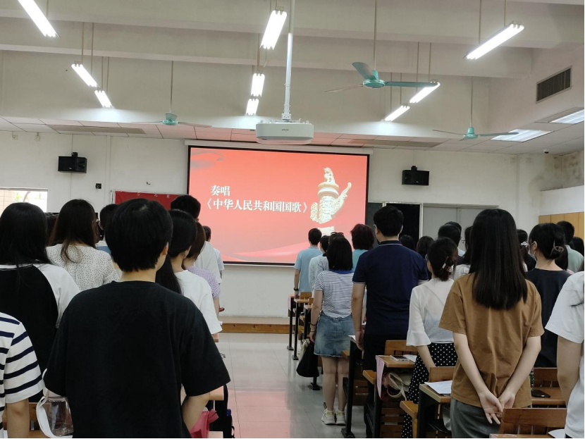 罗诞铖报告到会人数,全体起立,奏唱中华人民共和国国歌。