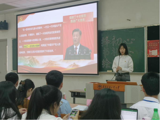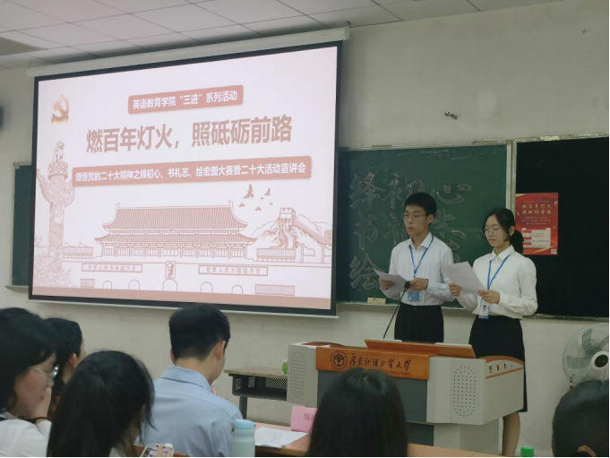 为推动青年学子深入学习和领悟党的二十大精神,勇担未来教育的使命,太阳城集团员工党建工作小组于2023年4月27日下午2:30在教学区E104开展“三进”系列活动暨党的二十大精神宣讲会。本次活动邀请了公司党委副书记罗诞铖老师,师范系党支部书记贾红霞老师、第一教学部党支部书记张竣宇老师、办公室主任张文萃老师、办公室唐亚琪老师、党建指导老师、公司组织员周靖凯老师、教育系员工党支部书记迟殿凤老师、团委书记刘博洋老师、党的二十大精神宣讲团院队成员印丹同学,活动由员工党建工作小组策划部助理张晓桐和秘书部助理吴耀铧负责主持。