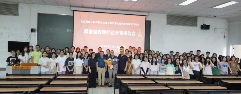 报告会结束后,周教授与现场师生合影留念,在校师生也为周教授送上荣休祝福。此次报告会是本学期教育系全省党建工作样板党支部工作坊暨主题教育专题学习活动的重要内容。教育系教工党支部还将继续深入开展形式多样的主题教育专题活动,推动主题教育走深走实。