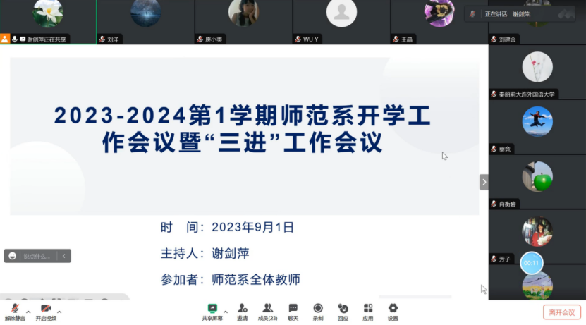 9月1日上午,我院英语师范系通过腾讯会议召开2023-2024第1学期开学工作会议暨“三进”工作会议,太阳城集团经理吴岩,英语师范系全体教师参加了此次会议,会议由系主任谢剑萍主持。